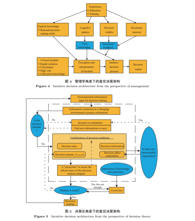汉语 “直觉” 出自鲁迅《花边文学 · 算账》: “但我直觉的感到, 这恐怕是折了本, 比用庚子赔款来 养成几位有限的学者, 亏累得多了. ” 在我国古代的道家、儒家、佛家均已意识到直觉的存在并提出运 用直觉思维认识世界. 其中, 道家是最先提出并运用直觉思维认识世界的. 道家认为 “道” 是宇宙的本 体, 但 “道” 作为无形无名的绝对, 是不能用概念所认识的, 只能靠直观或体悟 [14] . Pondy [15] 指出, 进 行战略决策时必须同时考虑理性过程与直觉过程. 例如在高速环境中, 通过直觉可以在没有数据或先 例的情况下做出决策 [16] . 在这种环境下, 人类主要面对的挑战是收集信息的时间限制与不稳定环境 本身需要大量数据之间的矛盾, 并且数据往往又是缺乏足够可靠性的. 而直觉的方法可以与先前习得 的经验结合, 并将在决策过程中发挥关键作用 [17] . 在对抗激烈的运动中, 直觉同样发挥着不可替代的作用. 对球类等运动的研究表明, 在竞争激烈、攻防转换迅速的比赛中, 运动员面临巨大压力下, 在对 对手进行准确的预判时, 往往倾向于发挥直觉决策的能力 [18] . 虽然在运动中与企业管理中应用的直 觉场景不同, 但这几类场景具有一定的相似性, 即决策条件与环境变化很快以至于决策者不能用常规 的逻辑推理给出答案 [19] , 而经验丰富的人类专家可以利用有限的信息在有限的时间里做出一个较为 准确的决策. 这些实际案例都启发着我们, 需要探索这一能力产生的机理与实现的架构.