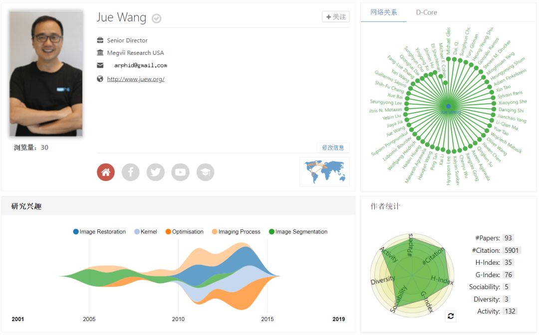 再来看看这位大牛!他是前Adobe历史上升职最快的首席科学家;他同时在三大顶会发表过65篇学术论文、手里带过31位博士实习生、获得了64项美国专利;他曾助力好莱坞影像特效公司拿下奥斯卡科学技术奖;他正带领一支全球团队,缔造AI影像之王;他就是旷视美国研究院负责人(MEGVII Research US)——王珏。