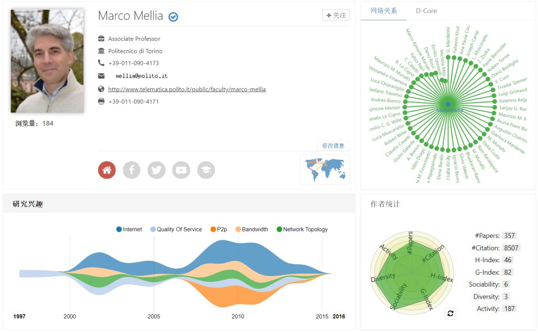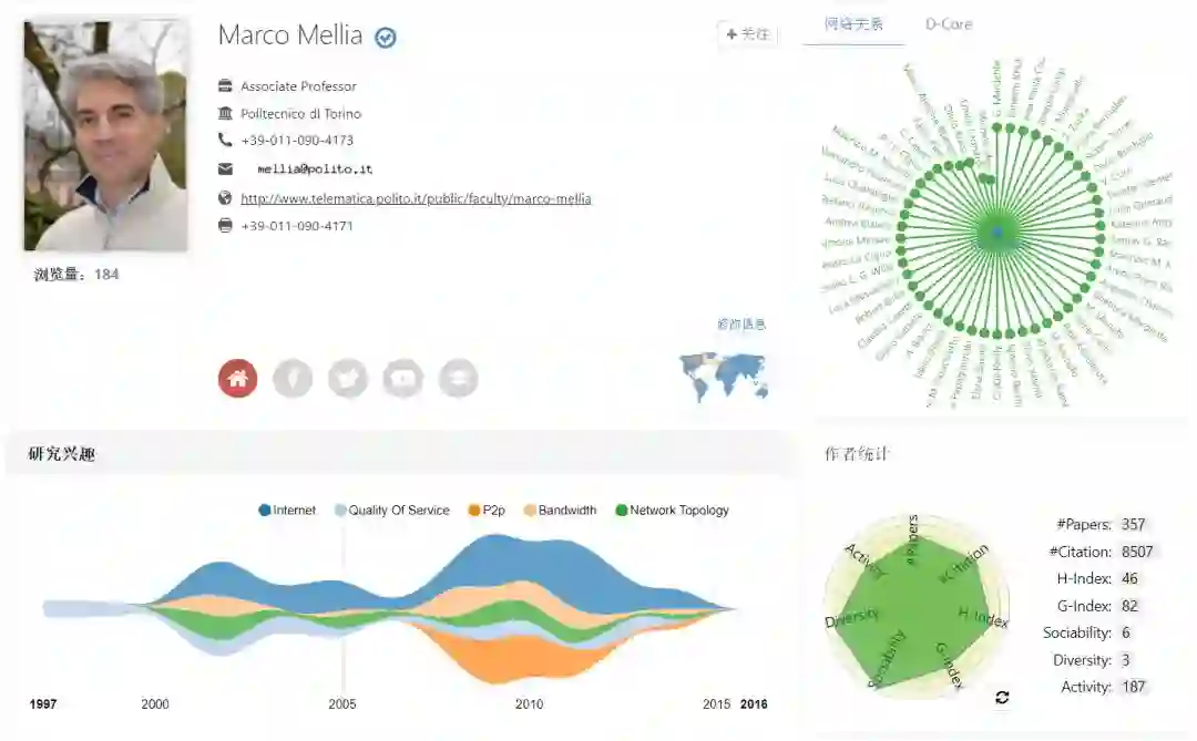 还有一位大牛,经小脉测算发现他是一位高活跃度、高引用量的新锐学者,他在Internet、Quality of Service、P2p、Bandwidth、Network Topology、Internet Traffic、Transport Protocols、Queueing Theory等方面有广泛的建树, H指数为46,引用量高达8507。