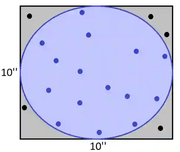 由于圆是在边长为10英寸的正方形内,因此可以容易地计算出它的面积为78.5平方英寸。 另一种方式,我们可以在正方形内随机抽取20个点。然后,我们计算在圆内的点的比例,并乘以正方形的面积。而这个数字是一个非常好的圆圈面积的近似值。