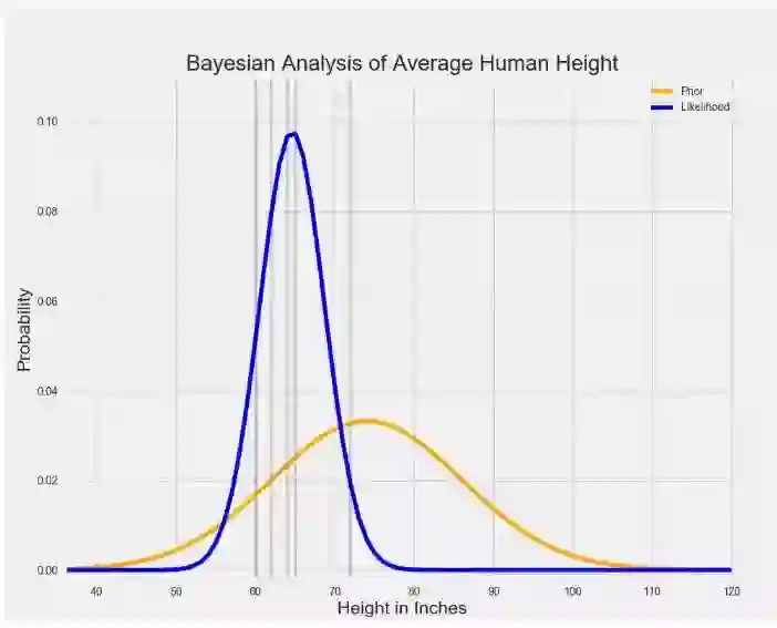 当先验和可能性结合在一起时,数据(可能性分布表示)弱化了个体在巨人中长大的可能性。 尽管那个人仍然认为人的平均身高比数据告诉他的稍高一些,但是他最相信的还是数据。