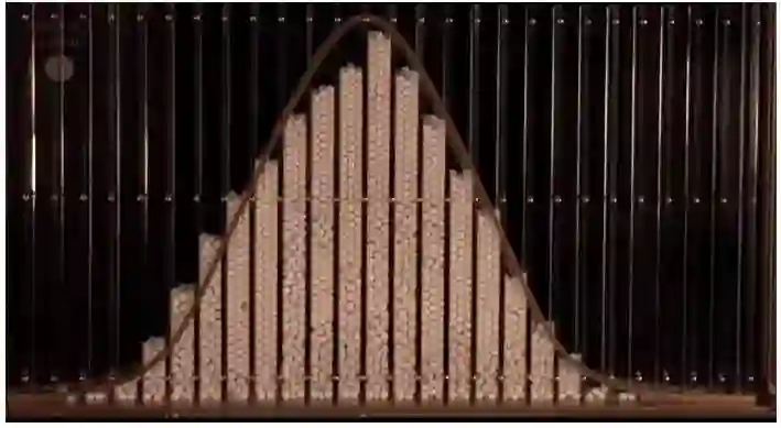 在十九世纪, 钟形曲线 被看作是自然界中一种常见的模式。(例如,我们已经注意到,人的身高分布是一个钟形曲线)。Galton Boards通过在装有钉子的木板上放置大理石来模拟重复随机事件的平均值,重现了大理石分布的正态曲线: