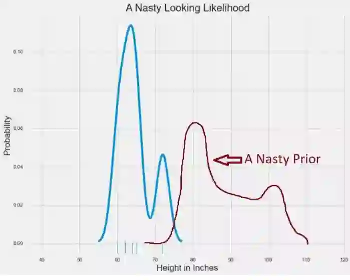 在两条钟形曲线的情况下,求解后验分布是非常容易的。 有一个简单的方程来结合这两者。 但是如果我们的先验分布和可能性分布不那么好呢?