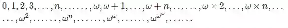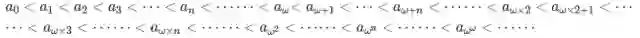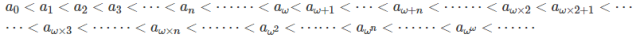 因为an各不相同,所以可以按照通常的习惯把所有的"≤"改成"<"。任何不在这个序列中的元素(如果有的话)都比这列元素中的任何一个大。从A中去掉所有的an,如果还能得到一个非空子集的话,那么这个子集中还有最小元素。刚才标记an序列的时候所有的自然数都用上了,那么这个元素就赋于一个新的标号:记为aω,依此类推,又得到一列元素a(ω+n),所以现在A中的前面一部分元素在"<"的顺序下排成这个形状: