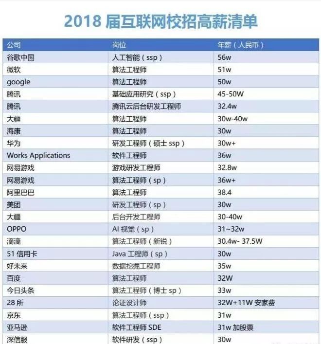 其中包括谷歌中国、微软、google、腾讯、大疆、海康、华为、网易游戏、阿里巴巴、滴滴、百度、今日头条的知名互联网企业,他们给校招生开出的年薪水平均在30万以上,提供以上薪资水平的岗位也多为算法工程师、研发工程师、软件工程师等技术性较强的岗位。