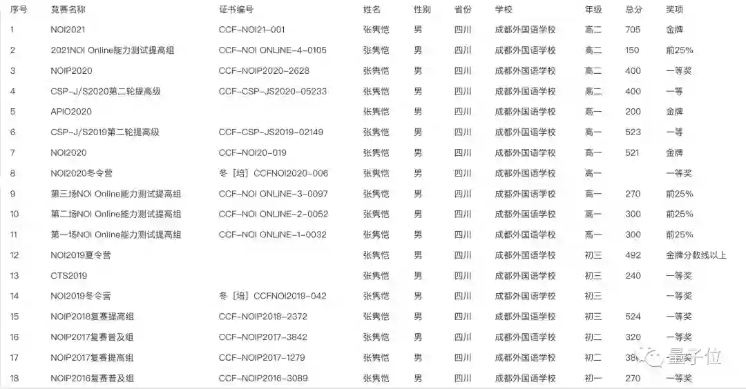 张隽恺初高中均就读于成都外国语学校,初中起就开始参加各级各类数学、信息学竞赛。