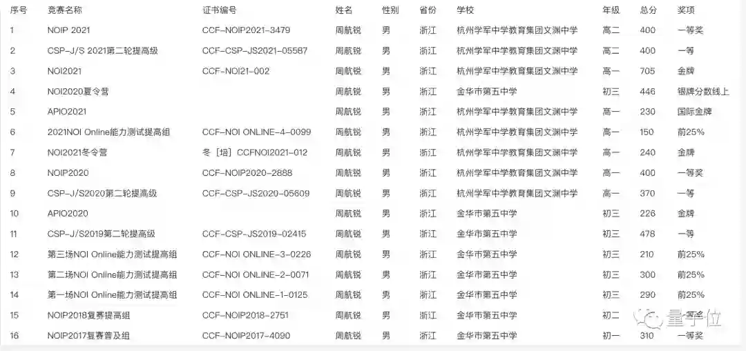 去年,周航锐参加 NOI ,先是成为浙江赛区唯一满分学生(也是全国唯一获满分的高一学生),最后获得了金牌,与此次IOI 2022中国队队友、同获金牌的张隽恺并列全国第一。