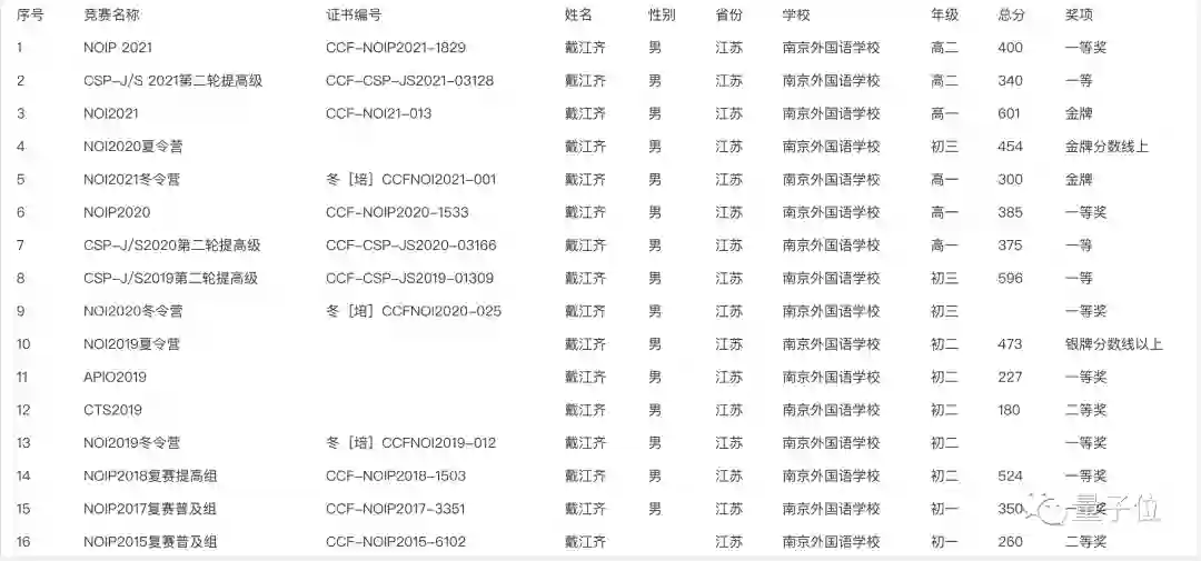 小学四年级,戴江齐开始学习信息学,四年级升五年级时就曾在省级比赛中获奖。