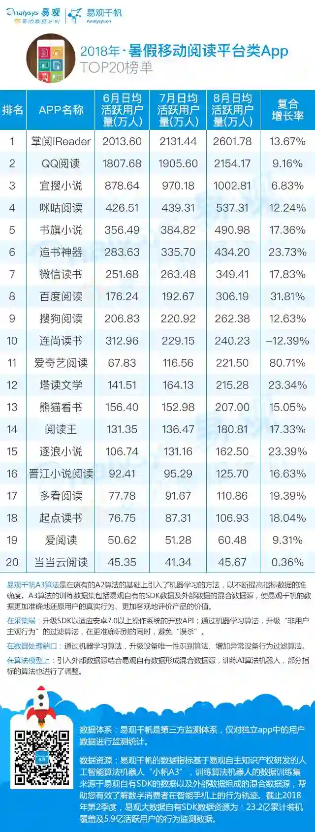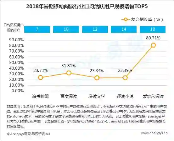 1.数据来源:易观千帆;2.日均活跃用户量=average(单月内每天的活跃用户量);3.图中以8月数据为依据降序排列;4.连尚读书复合增长率为负是因为其部分6月数值有缺失。5.复合增长率是指6月至8月的复合增长率。