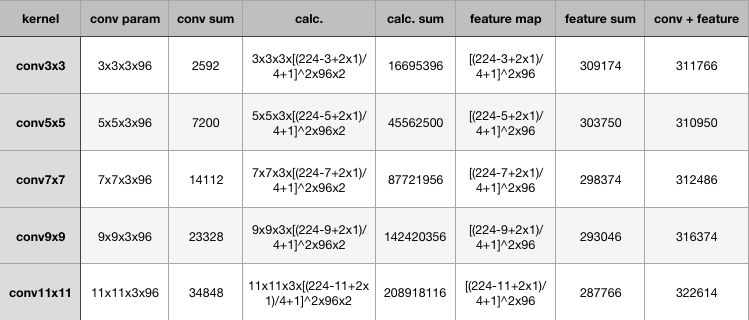 在计算量这里,为了突出小卷积核的优势,我拿同样conv3x3、conv5x5、conv7x7、conv9x9和conv11x11,在224x224x3的RGB图上(设置pad=1,stride=4,output_channel=96)做卷积,卷积层的参数规模和得到的feature map的大小如下: