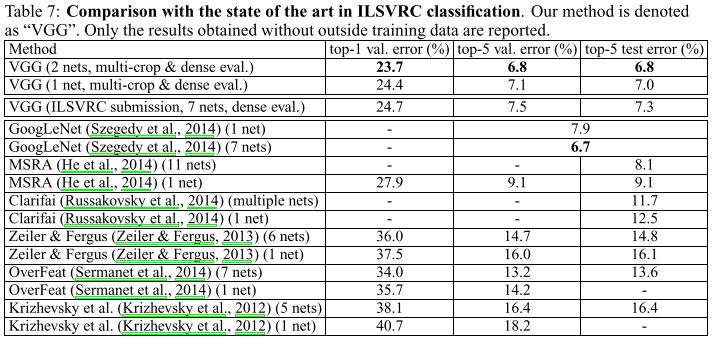然而,分类性能上同样的单模型,VGGNet比GoogLeNet在top5的错分率要低,虽然不确定是否是因为GoogLeNet没做multi-crop和dense eval.,但假设他们都做了,这样看来似乎VGG从实验结果上表现出其结构设计上比GoogLeNet更适合解决分类问题。