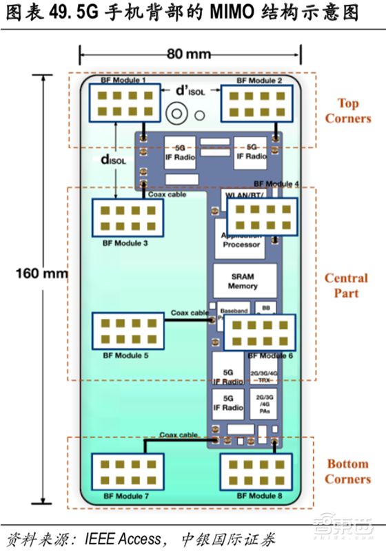 下图给出了针对5G手机提出的一种分布式相位阵列MIMO结构的手机设计方案,其中有8个相控阵列单元形成波束赋形模组,内嵌在手机壳背面下方。