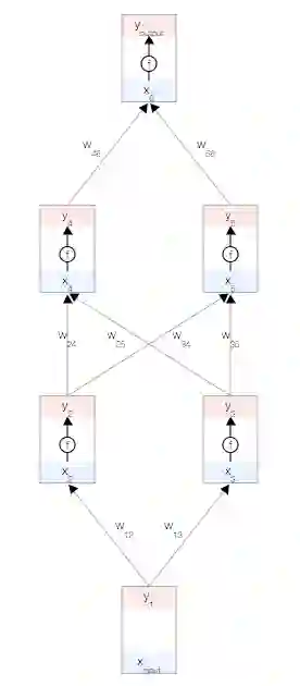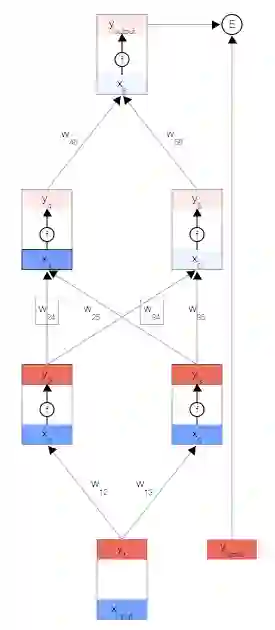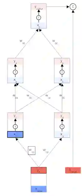 如上图,你会看到一个神经网络,其中包含一个输入节点、一个输出节点,以及两个隐藏层(分别有两个节点)。