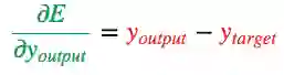 我们开始反向传播误差导数。 由于我们拥有此特定输入样本的预测输出,因此我们可以计算误差随该输出的变化情况。 根据我们的误差函数 ,我们可以得出: