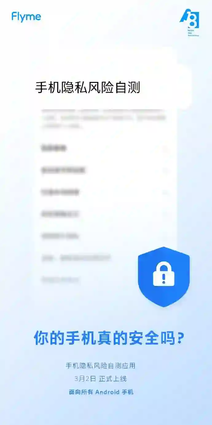 魅族 Flyme 官微今日宣布,将发布一款手机隐私风险自测应用,于 3 月 2 日正式上线,并面向所有 Android 手机。