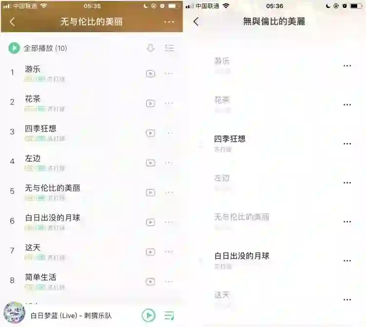 ▲苏打绿2007年专辑《无与伦比的美丽》中,10首歌中有8首未在豆瓣FM上线,同样的情况还存在于他们曾获金曲奖最佳国语专辑奖的专辑《冬·未了》等(图左为QQ音乐,图右为豆瓣FM)