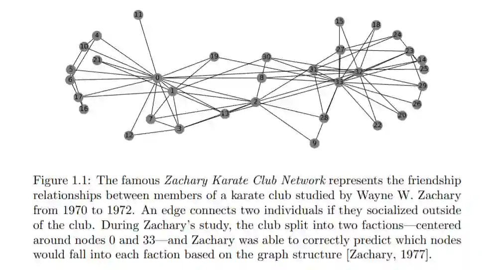 图是一种普遍存在的数据结构和描述复杂系统的通用语言。在最普遍的观点中,一个图仅仅是对象的集合。,以及一组交互(例如,节点)。(边)在这些对象对之间。例如,为了将一个社会网络编码为一个图,我们可以使用节点来表示个体,使用边来表示两个个体是朋友(图1.1)。在生物领域,我们可以使用图中的节点来表示蛋白质,并使用边缘来表示各种生物相互作用,例如蛋白质之间的动力学相互作用。
