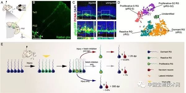 图注: A.成年斑马鱼中脑视顶盖损伤示意图; B. 稀疏标记的中脑视顶盖放射状胶质细胞; C.损伤引起静息态放射状胶质细胞增殖; D.单细胞测序分析显示损伤后的视顶盖存在着三类放射状胶质细胞: 静息态、激活态和增殖态。 E.模式图: 损伤引起损伤位点下方所有静息态放射状胶质细胞转变为反应态; 只有25%反应态细胞转变为增殖态; 此过程受到Notch/Delta介导的侧向抑制调节; 在损伤条件下,增殖态放射状胶质细胞主要进行胶质增生,产生~3-5%的新生神经元; 新生神经元可以存活至300天; 在Notch信号通路抑制条件下,静息态放射状胶质细胞可转变为增殖态,但只产生~1%新生神经元; 然而,在损伤后特定时间窗口(损伤后4-5天)抑制Notch信号通路会驱使反应态放射状胶质细胞进入细胞周期,这些细胞会产生更多的新生神经元(~12-20%); 这些新生神经元中的绝大部分却只能存活少于25天。