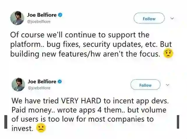 说出上面那句话的,是曾经负责 Windows Phone 的微软副总裁 Joe Belfiore。就在 10 月 9 日,当有网友在 Twitter 上问及微软旗下移动操作系统 Windows Phone( 如今官方称之为 Windows 10 Mobile)的相关问题时,Joe Belfiore 给出了这样的答案。
