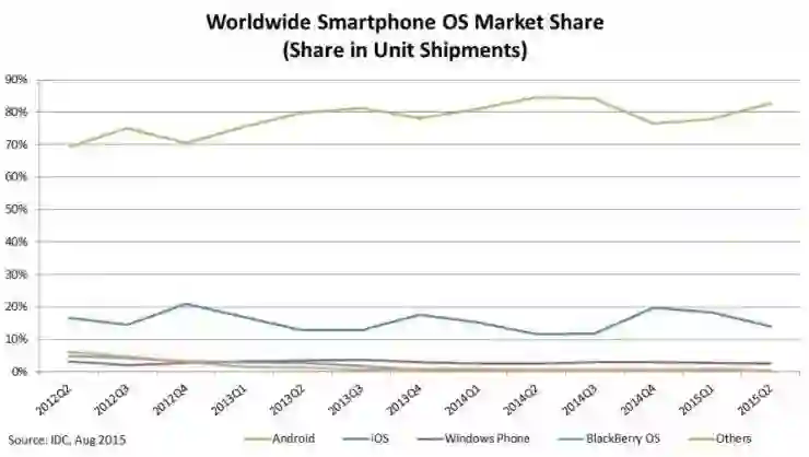Windows Phone 的市场份额几乎一直在 5% 下徘徊。一直到 2015 年第二季度之前,Windows Phone 的市场份额看起来颇为稳定,没有明显的衰落迹象。但是从 2015 年 第三季度开始,Windows Phone 的市场份额开始继续下滑,一直到今天,几乎趋近于零。