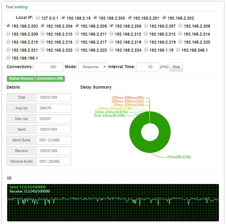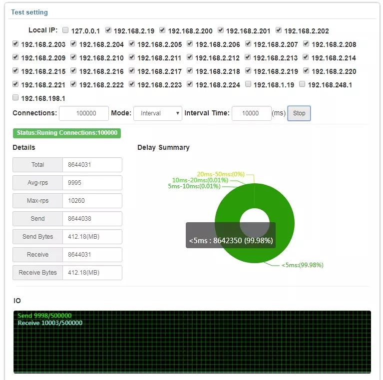 100万在线的时候,平均并发在100000RPS;大部分请求同样在100ms内响应完成,程序大部分工作时间的CPU在40%以内,内存占用大概在7-9G.不过这次测试的延时相对比较高,由于负载量的情况测试端也会引起延时的问题,所以导致整体延时比较高。