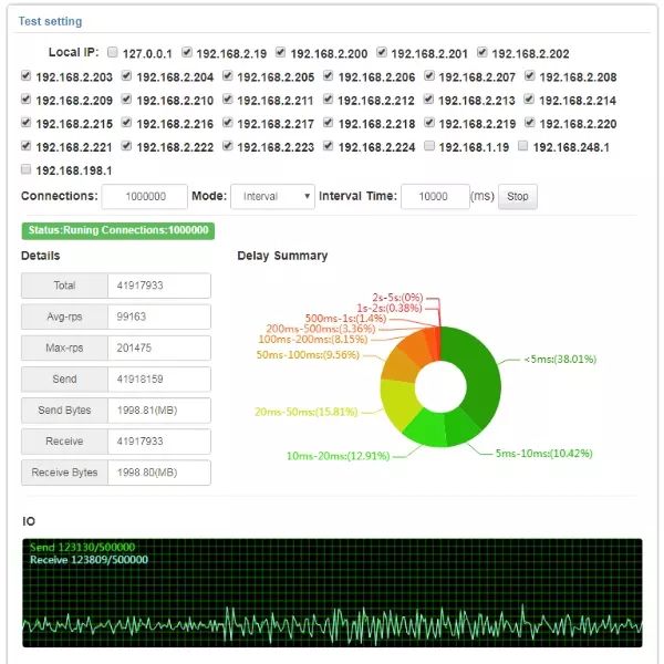 其主要原因还是整体的RPS并不高,当在100万连接的情况吞吐值在10万RPS;这样也可以说明在网络服务中占CPU资源的是请求的响应量而不是在线的连接数,不过当在线连接数比较多的情况还是需要占用大量的内存;所以在制是定硬件规划的时候可以针对在线连接数和请求量进行一个结合规划。