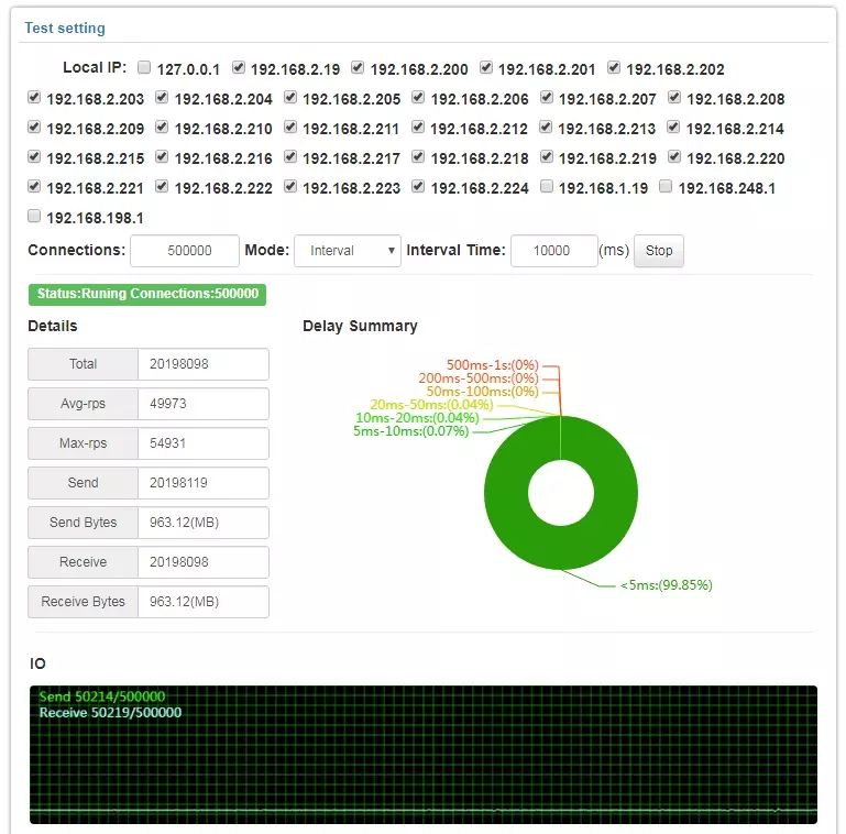 测试结果来看在50万在线的时候,平均并发在100000RPS;大部分请求同样在5ms内响应完成,程序大部分工作时间的CPU在20%以内,内存占用大概在3.5G