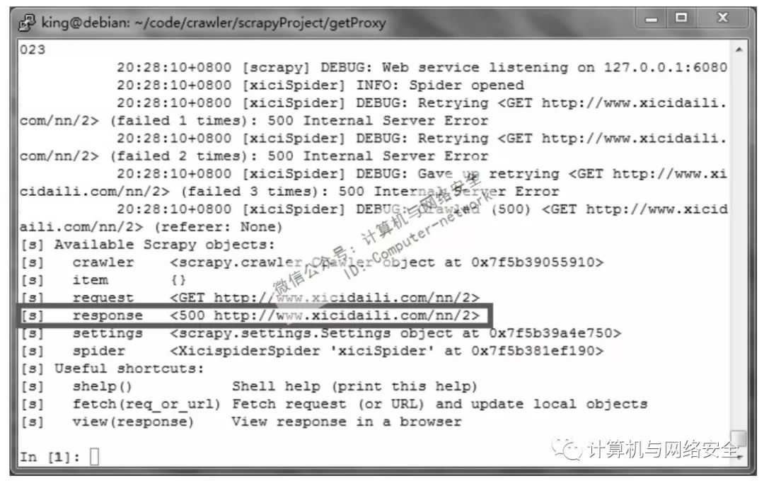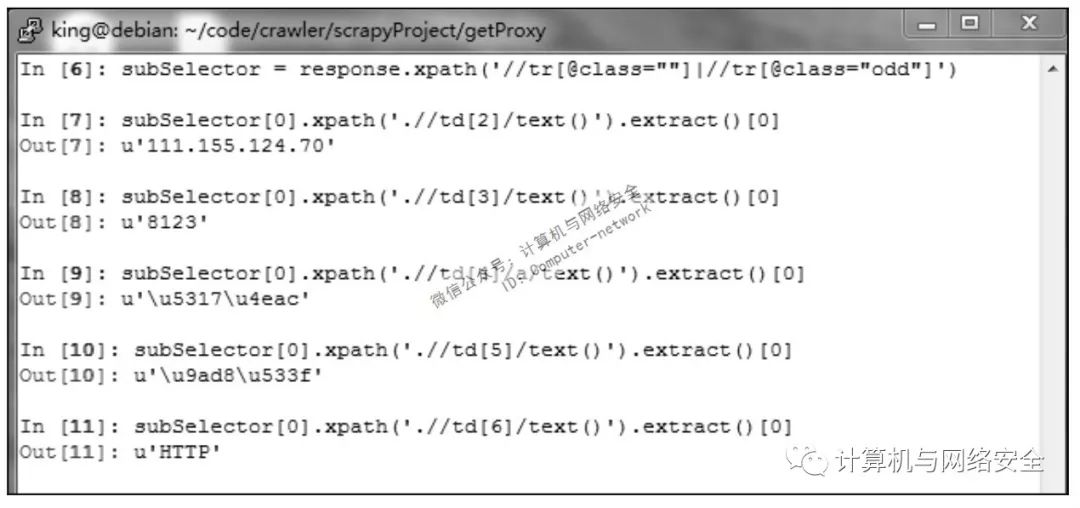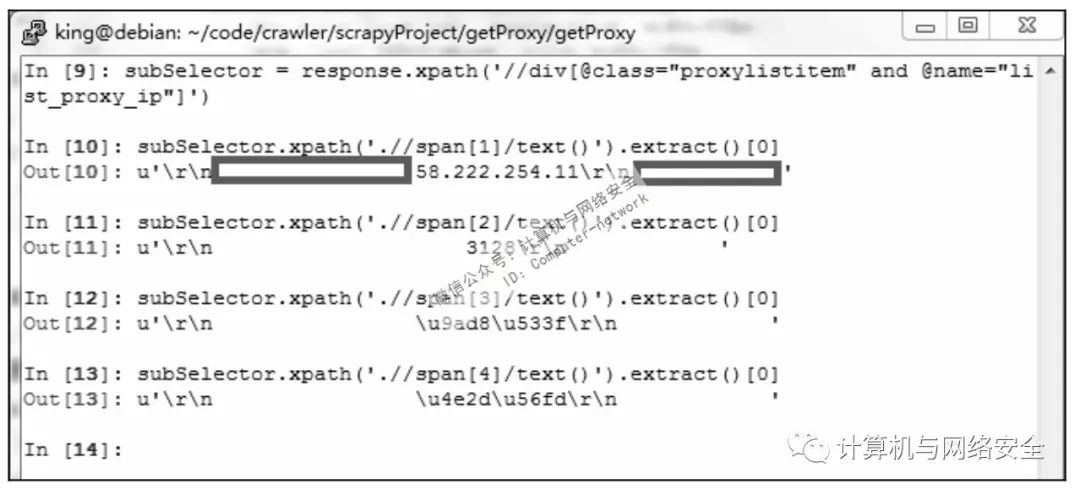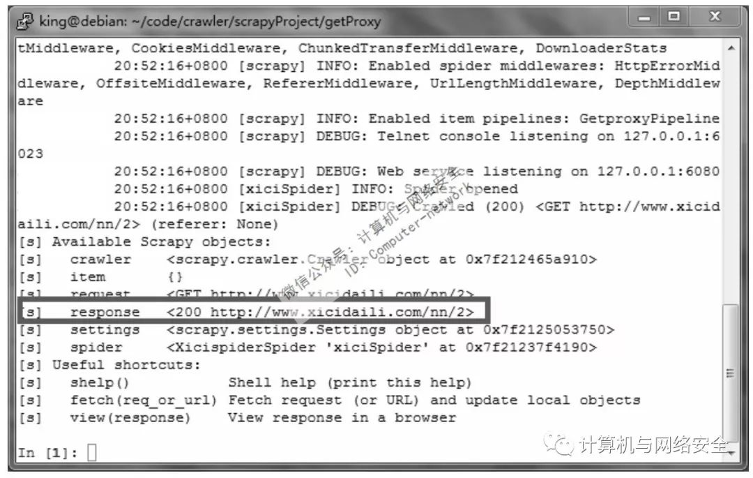 再回到getProxy项目的目录下,使用scrapy shell测试如何获取有效数据。执行命令: