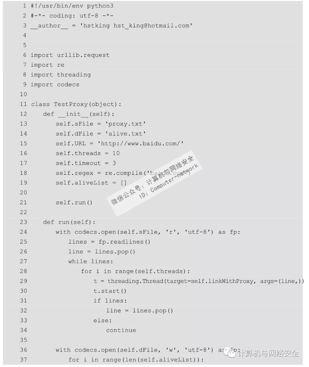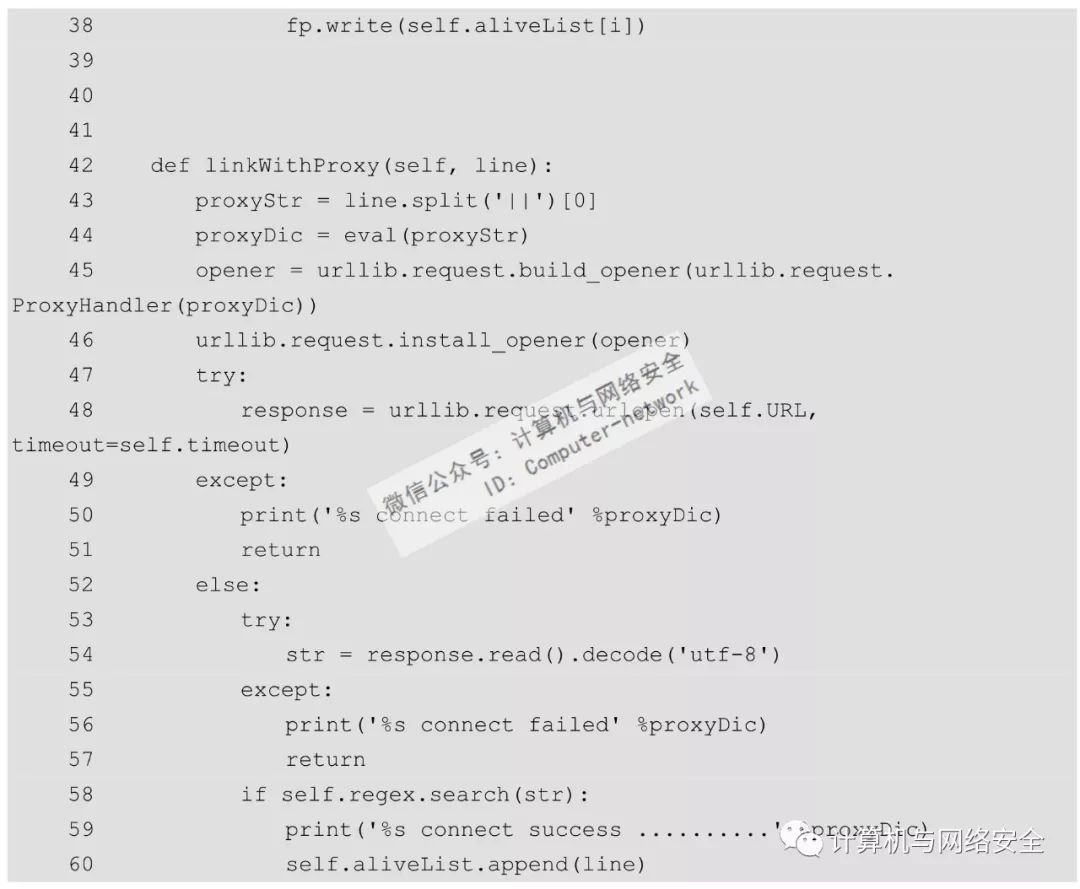 在14行中加入了两条竖线,是为了以后能方便地将代理字典({'http':'http://1.2.3.4:8080'})从字符串中分离出来。在15行中,写入文件时使用了strip()函数去除所得数据左右两边的空格。