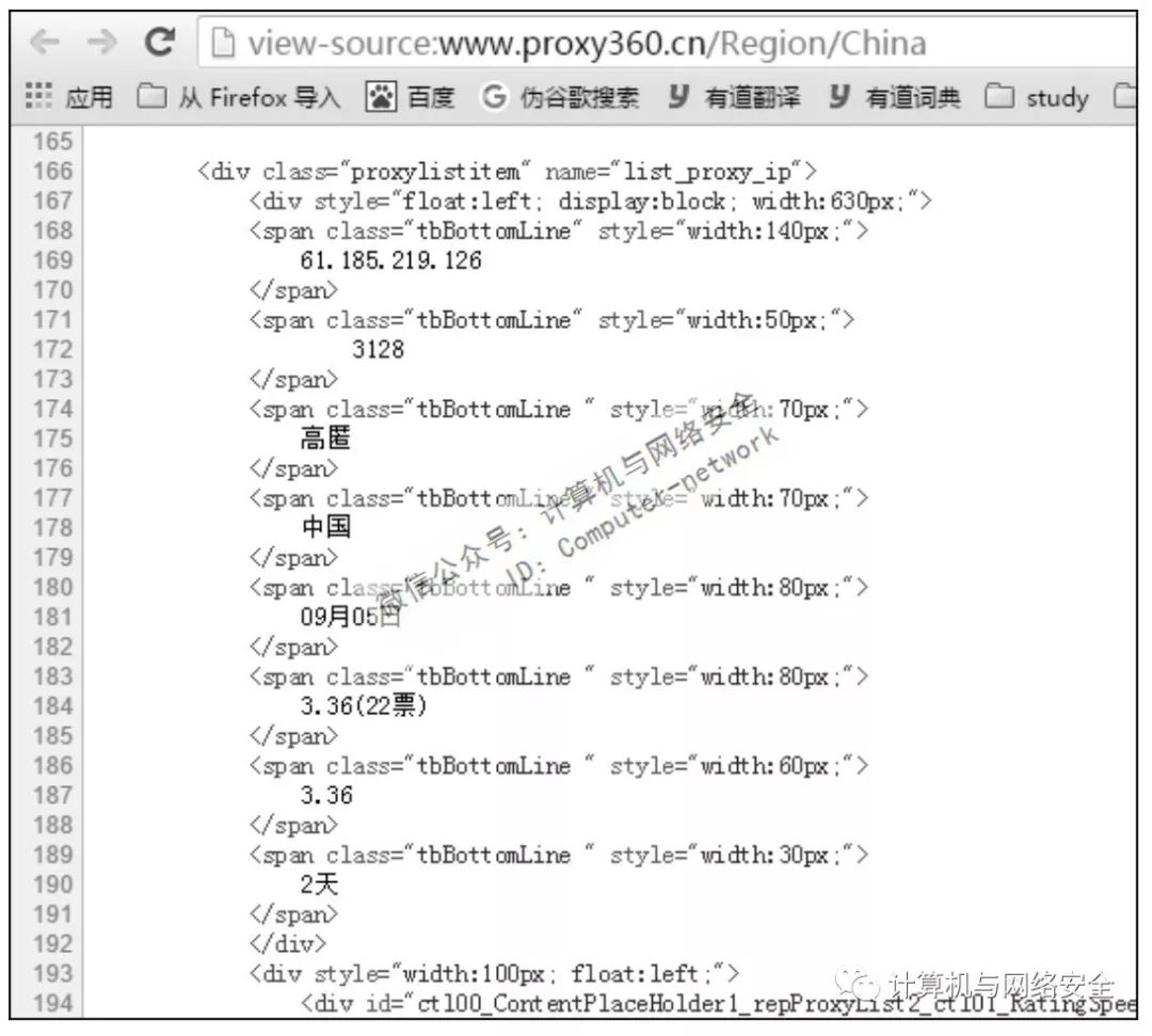 返回的数据中含有代理服务器(难道返回代码为200时,还有返回数据不含代理服务器的吗?这个还真有)。测试一下如何使用选择器在response中的得到所需的数据。在浏览器中打开http://www.proxy360.cn/Region/China,在网页的任意空白处右击,选择“查看网页源代码”,打开页面的源代码网页,如图3所示。
