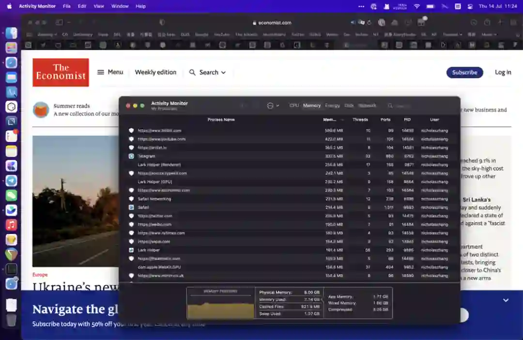 可能正是由于 Apple 设计的内存交换机制在起作用,才让疯狂多开标签页也不会无限增大内存压力。不过,这不代表 MacBook Air 就永不卡顿,或者 8GB 内存就够用到天荒地老。从我使用 M1 版 MacBook Pro 的经验来看,如果你需要在后台驻留大量 app,而且使用类似《Photoshop》这样狂吃内存的工具,那还是得考虑购买大内存版本,不然用个一年半载之后多少还是会遇到一些卡顿现象。
