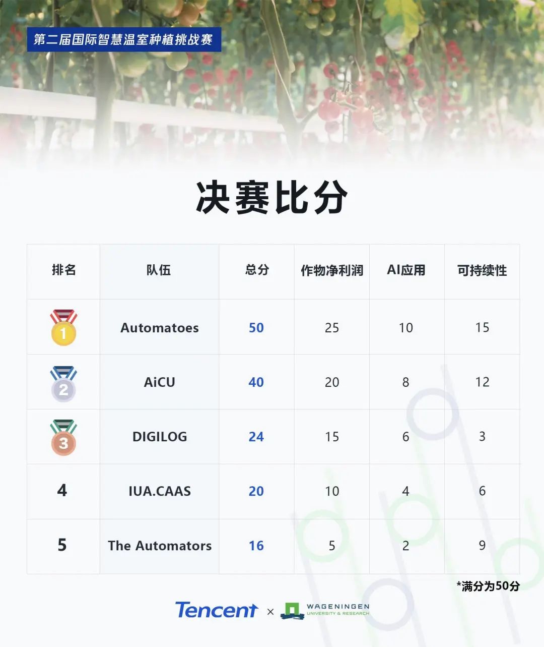 比赛目标是在6个月内竞争选出小番茄的最佳智慧种植方案,并贴近五大目标:产量高、品质好、能耗少、自动化、技术可迁移。评审团最终按三个维度打分,一是作物净利润(占50%,包括产量、品质、价格等指标),二是AI应用(占30%,包括自动化、创新性、功能性、抗干扰鲁棒性、可规模化、可迁移性等指标),三是可持续性(占20%,包括水、肥、电、热和二氧化碳等资源的利用效率)。今年参赛的21支队伍来自26个国家,共200多人(去年15支队伍),我们也看到更多小型公司、独立农人和学生加入,呈现背景多元、百花齐放趋势。