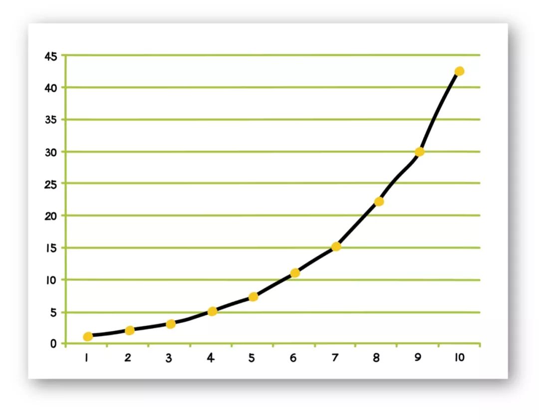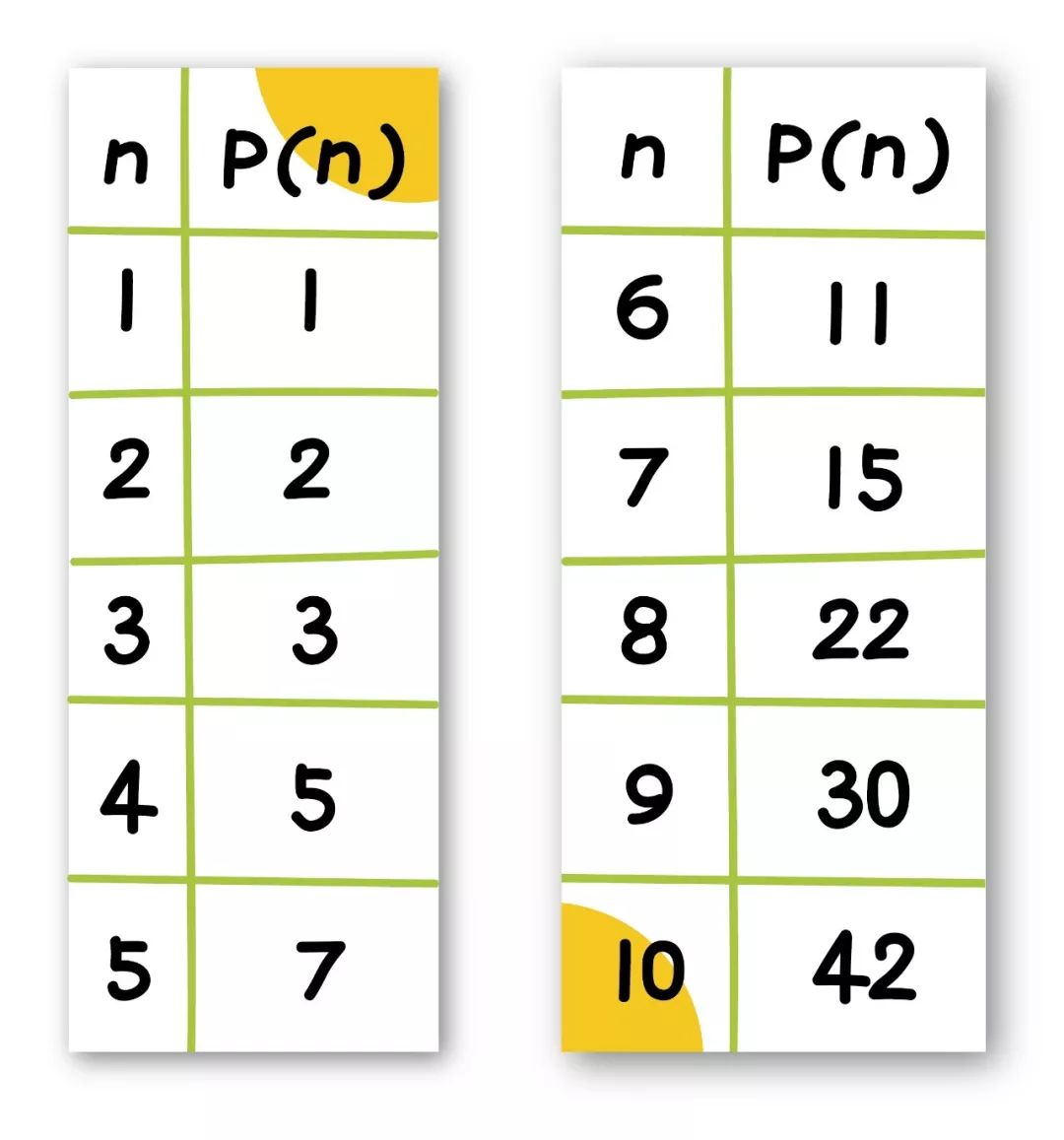 看起来,将一个数字n写成自然数之和,然后再数一数共有多少种方式,似乎是很简单的事。但事实上,随着n的变大,情况很快就无法掌控。也许你可以自己算出 P(5)=7,P(6) =11,但是再往下,你很快就会用光所有的草稿纸。下面的表格显示了直到 P(10)=42 的分拆数,这个数字已经非常大了。