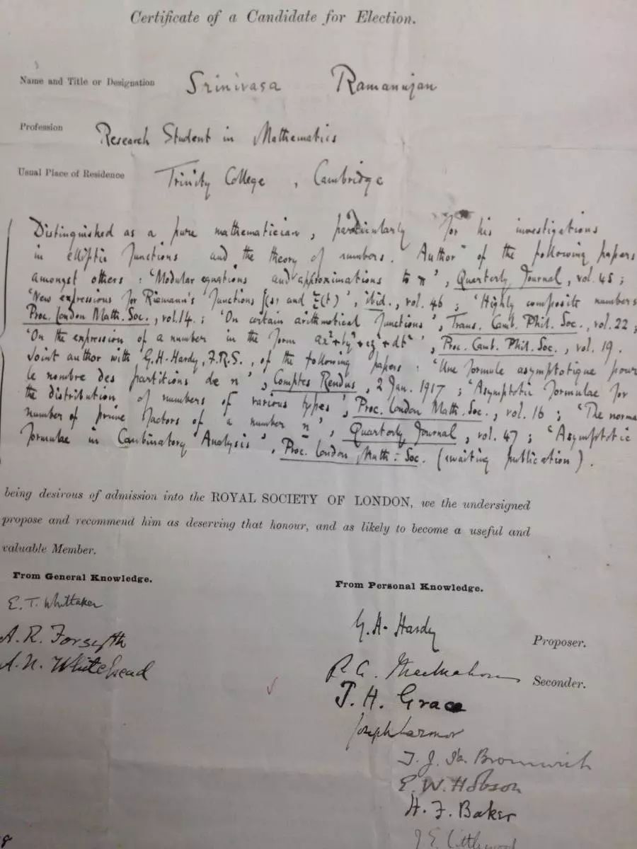 ○ 拉马努金被提名为皇家学会会员的证明。