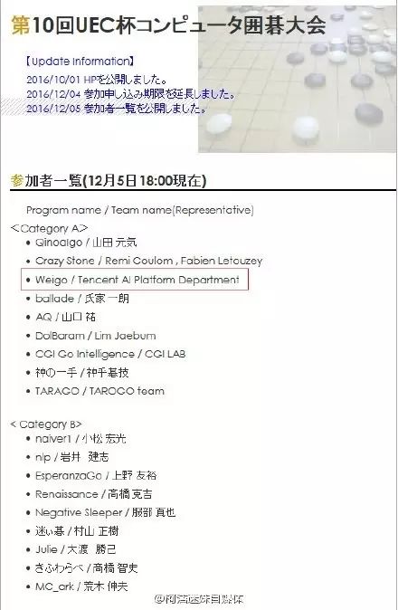 跟绝艺直接对战过的古力曾在微博暗示,这个绝艺其实是腾讯AI团队打造的人工智能体。当时有人在古力微博评论区爆料:将于2017年3月18日至19日举行的日本UEC电脑围棋大赛的报名者名单中,腾讯AI组的Weigo赫然在列。今天我们知晓,这个Weigo升级为如今的“绝艺”了。