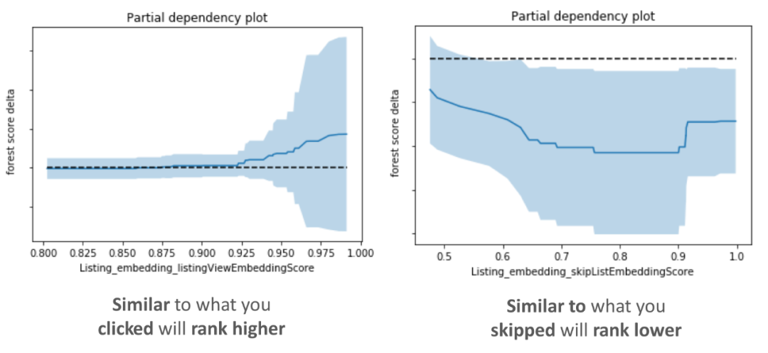 在右边的子图中可以看到,EmbSkipSim的值越大(房屋类似于用户跳过的房屋,即不喜欢),模型得分越低。