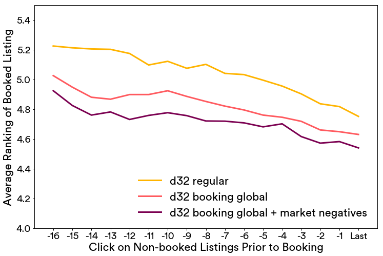 在下图中,我们显示这样一个评估的结果,搜索结果基于在嵌入空间的相似性重新进行排序,预订了的房屋的排序结果序是按照每次预定前的点击数量的平均值来计算得到,最多追溯到预定前的17 次点击。