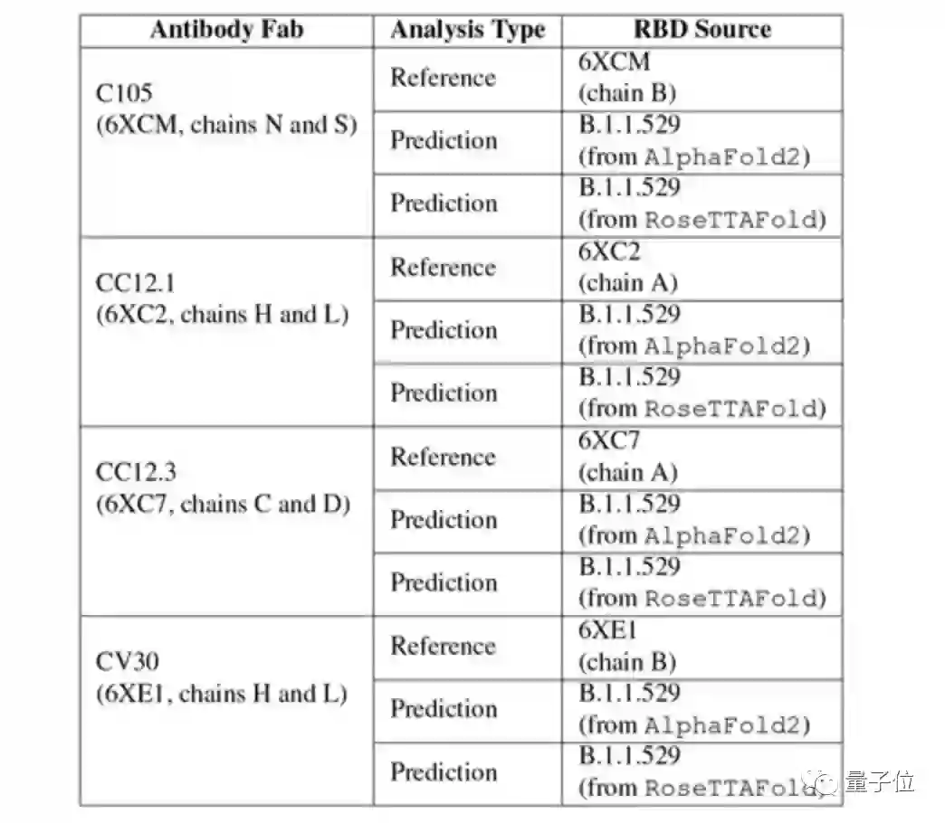 在这个步骤中,Ford团队基于上面得到的奥密克戎RBD预测结构,模拟了与四个现有中和抗体结构的相互作用(分别为C105, CC12.1, CC12.3, and CV30)。