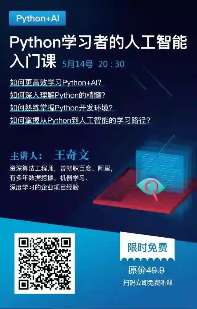 当然,除了此次的公开课福利,王奇文老师还将在5月18号在AI慕课学院开设《好玩儿的Python-从数据挖掘到深度学习》,现正火热接受报名中,小班授课,名额有限~点击下方“阅读原文”立即了解课程更多详细信息。