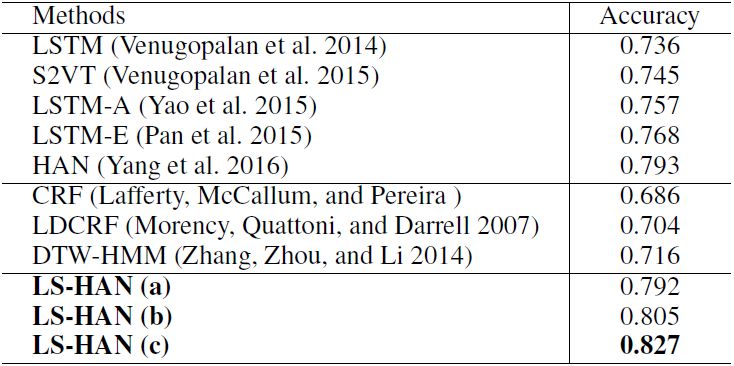受利用长短期记忆(LSTM)网络进行视频描述生成的启发,研究者使用分层注意力网络(HAN,LSTM 的扩展)绕过时域分割,考虑结构信息和注意力机制。该方案需要向 HAN 馈送整个视频,然后逐词输出完成的句子。但是,HAN 可以根据输入视频和前一个单词来优化生成下一个单词的概率,但忽略了视频和句子之间的关系(Pan et al. 2015)。因此,它会遇到是否稳健的问题。为了解决这个问题,研究者整合了潜在空间(LS,Latent Space)模型,以明确地利用视频和文本句子之间的关系。