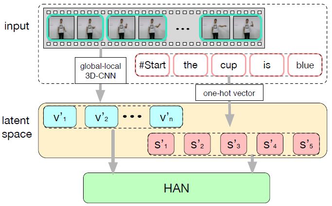 图 2:LS-HAN 框架。输入是视频和配套的标注句子。视频用全局-局部特征来表示,每个单词用 one-hot 向量进行编码。它们被映射到同一个潜在空间,以对视频-句子相关性进行建模。研究者基于映射结果,利用 HAN 进行自动句子生成。