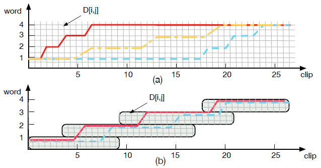 图 3:动态时间规整(DTW)生成的相关规整路径。X 轴表示帧索引,Y 轴表示词序索引。网格表示矩阵元素 D[i, j]。(a)表示原始 DTW 的三种可能的对齐路径。(b)表示 Window-DTW 的对齐路径。