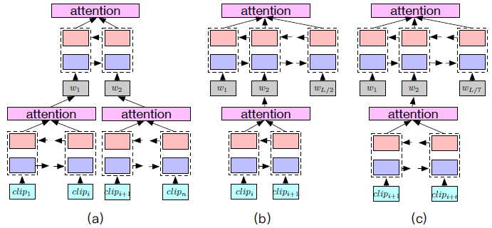 图 5:测试阶段中的对齐重建。(a)将视频所有的片段分割成两个子序列,并编码成 HAN;(b)将每两个相邻的片段分割成一个子序列;(c)将所有片段平均分割成 7 个子序列(7 是训练集的平均句子长度)。