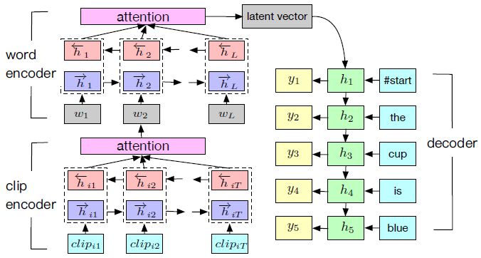 图 4:HAN 通过注意力层对视频进行分层编码,并对输入序列加权。它将隐藏向量表示逐词解码,组合成句子。
