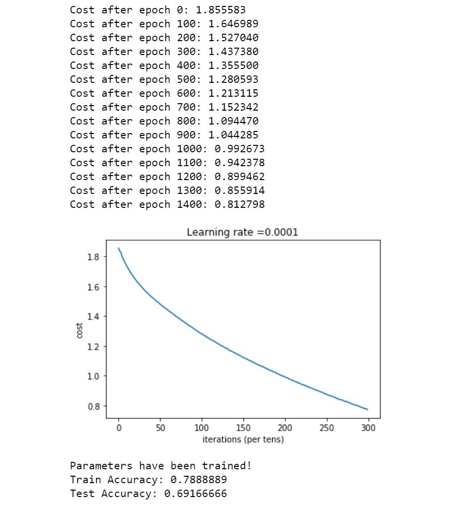 def model(X_train, Y_train, X_test, Y_test, learning_rate = 0.0001, num_epochs = 1500, minibatch_size = 32, print_cost = True): ops.reset_default_graph() tf.set_random_seed(1) seed = 3 (n_x, m) = X_train.shape n_y = Y_train.shape[0] costs = [] # Create Placeholders of shape (n_x, n_y) X, Y = create_placeholders(n_x, n_y)