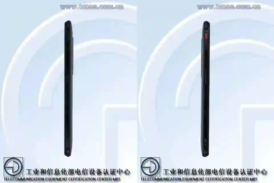 不难发现,红魔游戏手机 7 延续了红魔系列的设计风格,机身右侧的顶部和底部带有超声波的虚拟肩键设计。红魔游戏手机 7 型号为 NX679J。从入网的参数来看,红魔游戏手机 7 有绿、黑、红蓝渐变 3 种配色,支持屏下指纹识别。