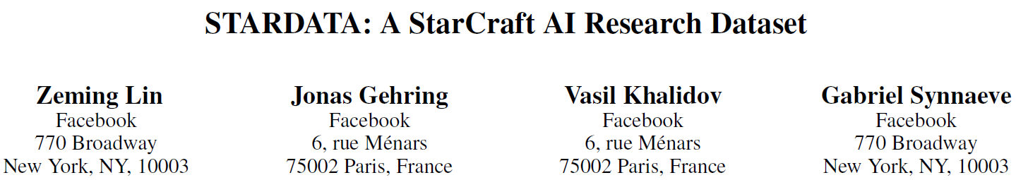 在 AlphaGo 征服围棋之后,即时战略游戏《星际争霸》已经成为各家科技巨头与大学的下一个目标。Facebook 在这一方面的研究似乎正处于领先地位。7 月初,田渊栋等人开源了基于星际争霸的人工智能游戏平台(参见:Facebook 开源游戏平台 ELF,简化版《星际争霸》完美测试人工智能)。最近,Facebook 又发布了一个大体量星际争霸录像数据集 STARDATA,旨在为广大研究者提供方便。