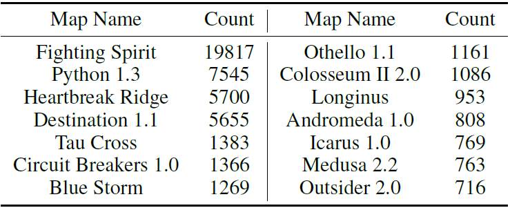 表 1: 星际争霸 AI 数据集收集比赛的来源。GG=GosuGamers.net,TL=TeamLiquid.net,IC=ICCup.com,YG=ygosu.com,BR=bwreplays.com 。