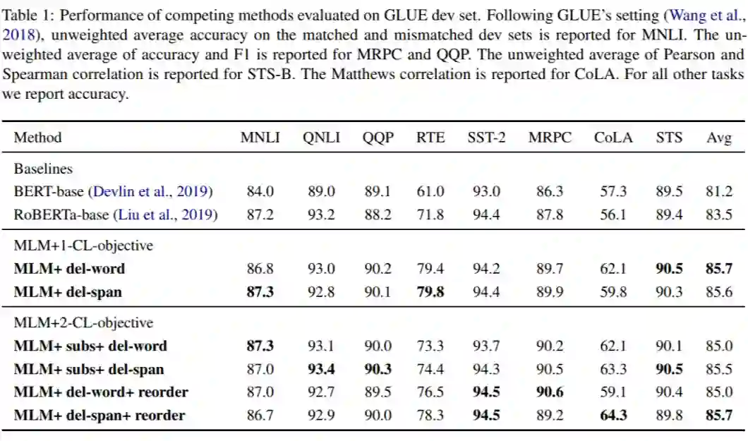 通过这种方法,就能够帮助模型识别相似语义的句子,与此同时,作者还保留了原来的 Mask Language Model(MLM)的损失函数,将两个损失函数结合,就得到了整个方法的损失函数。