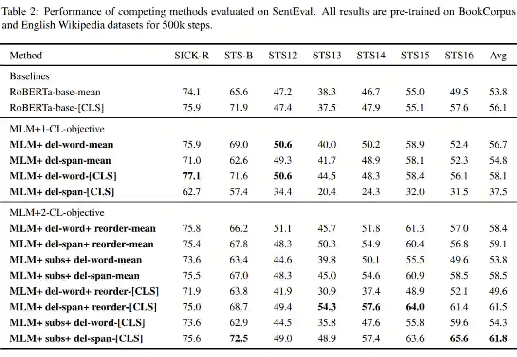 直观上理解,方法 1 和方法 2 可能会改变原有句子的意思,作者认为,随机删除一部分句子内容不会对句子的原始语义造成太大的影响。当然,在一些情况下,可能会改变句子的原始语义(例如把 not 删掉了),但这部分可以认为是适当的噪声,这有助于提升模型的鲁棒性。